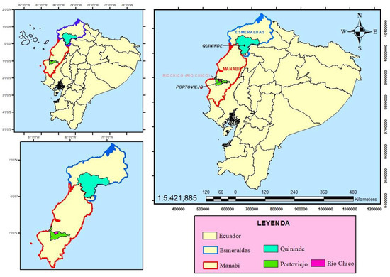 - Gobierno Autónomo Descentralizado Municipal del Cantón Quinindé. Plan de Desarrollo y Ordenamiento Territorial del Cantón Quinindé de la Provincia de Esmeraldas 2012–2021. 2012. Available online: https://docplayer.es/14719258-Plan-de-desarrollo-y-ordenamiento-territorial-del-canton-quininde-de-la-provincia-de-esmeraldas-2012-2021.html (accessed on 9 December 2022).