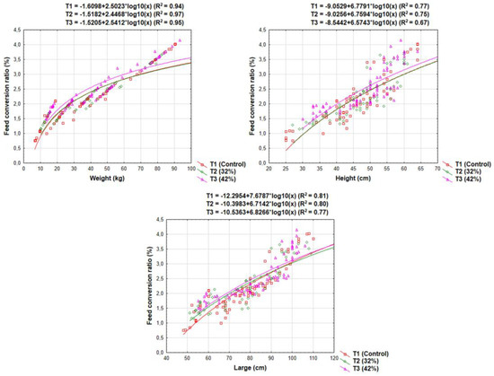 The relationship between body traits and feed conversion ratio in each treatment. T1: conventional feed with no corn replacement; T2: corn replacement with 32% of cassava + taro; and T3: corn replacement with 42% of cassava + taro.
