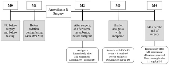 During the postoperative monitoring, the animals were kept in the same outdoor pens in groups of three or four. A camera (Canon PowerShot SX50 HS, Oita, Japan) was placed outside the outdoor pen, 1–2 m from the fence, using a camera tripod, and videos were recorded for a period of three minutes (without edition) at five time-points: M0—48 h before surgery and before fasting; M1—before sedation, during fasting (48 h after M0); M2—after surgery, three hours after animals were in sternal recumbency, before analgesia with morphine 0.1 mg/Kg IM; M3—one hour after morphine; when animals that showed a score >4 for UCAPS [10] received rescue analgesia with dipyrone 25 mg/kg IM; and M4—24 h after the end of surgery; when animals received flunixin meglumine at 1.1 mg/kg IM after the last evaluation (Figure 1).