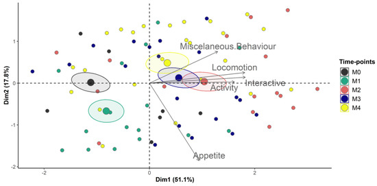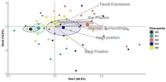 Biplot of the principal components analysis of the cow pain scale (CPS). Confidence ellipses were built according to the time-points and pain scores. Time-points: M0, 48 h before surgery and before fasting; M1, before sedation, during fasting (48 h after M0); M2, after surgery, three hours after animals were in sternal recumbency, followed by analgesia with morphine; M3, one hour after morphine; M4, 24 h after the end of surgery. Ellipses were constructed according to the pain assessment time-points (M0 black, M1 green, M2 red, M3 blue and M4 yellow). The ellipse referring to the time when animals were suffering pain (M2) was positioned on the right side of the figure; on the opposite side are the ellipses corresponding to the time-points in which animals were pain-free (M0 and M1), where items showed lower scores. The time-point of moderate pain (M4) is positioned on the right side closer to the centre. All items on the scale are influenced by time-points of pain (M2 and M3) as their vectors are positioned in the direction of these ellipses and demonstrated higher pain scores.
