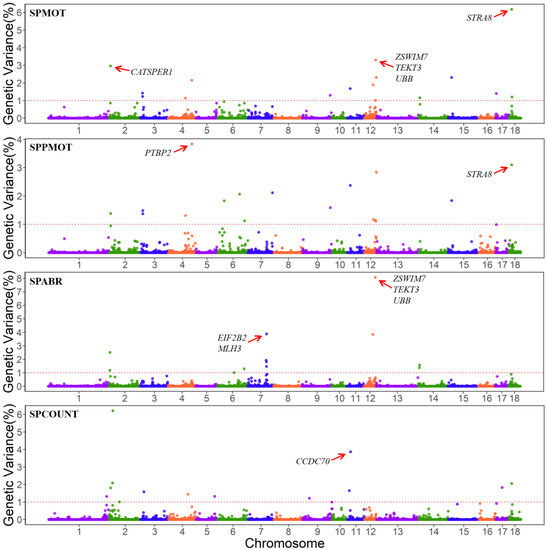 A total of 112 candidate genes were detected in the QTL regions of SPMOT, SPPMOT, SPABR and SPCOUNT traits (Table S1), of which 9 genes were reported to be associated with mammal spermiogenesis, testes functioning, and male fertility (Table 3). Furthermore, 16, 17, 12, and 13 QTL regions (windows that explained more than 1% of total genetic variances) were found for SPMOT, SPPMOT, SPABR and SPCOUNT (Figure S3).
