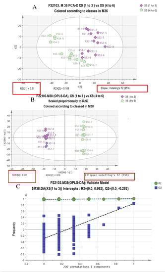 (A). Principal components analysis (PCA) of plasma metabolites from yak (n = 8) fed with a low- (1 to 3) and high-protein (4 to 6) diet. (B). Orthogonal correction partial least squares discriminant analysis (OPLS-DA) of the plasma metabolites from yak (n = 8) fed with a low- (1 to 3) and high-protein (4 to 6) diet. (C). OPLS-DA model permutation test chart.