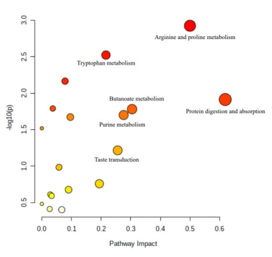 The PCA and OPLS-DA results are presented in Figure 1. All samples were scattered in the 95% confidence zone. Almost all of the samples from the two groups could be differentiated clearly, with the exception of XS6 5–7 (Figure 1A). The PC1 and PC2 account for 51% and 10.8% of the total variance, respectively. In the OPLS-DA, all the samples from the two different dietary protein groups could be differentiated clearly, and the PC1 and PC2 account for 32.2% and 23.5%, respectively, of the total variance (Figure 1B). The R2 X (the explanatory rate of the model in the X-axis), R2 Y (the explanatory rate of the model in the Y-axis) and Q2 (the predictive rate of the model) were 0.674, 0.998 and 0.844, respectively, which means that the model is valid and predictable (Figure 1C). Based on the differently expressed metabolites (Table 8), the KEGG analysis was performed (Table 9, Figure 2), and the results showed that the yaks fed diets with different protein levels showed differences in protein digestion and absorption, arginine and proline metabolism, tryptophan metabolism, purine metabolism, butanoate metabolism, taste transduction, pyrimidine metabolism, pantothenate and CoA biosynthesis, glutathione metabolism and renin secretion pathways.