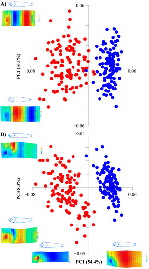 - Baken, E.K.; Collyer, M.L.; Kaliontzopoulou, A.; Adams, D.C. Geomorph v4.0 and GmShiny: Enhanced Analytics and a New Graphical Interface for a Comprehensive Morphometric Experience. Methods Ecol. Evol. 2021, 12, 2355–2363. [Google Scholar] [CrossRef]