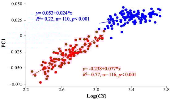 Linear regression between PC1 and log-centroid size (log-CS) during larval and juvenile stages of Chelon auratus. Red dots are larvae (24 dph), blue dots are juveniles (54 dph).