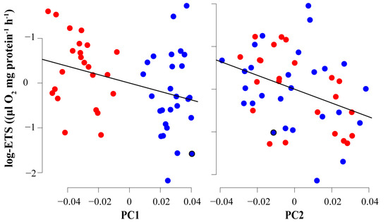 Stepwise regression analysis between the metabolic activity (log-ETS) and significant PC components during larval and juvenile stages of Chelon auratus. Red dots are larvae (24 dph), blue dots are juveniles (54 dph).