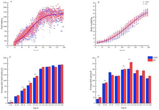 Growth performance of lambs at different ages (n = 22). Growth performance includes: (A) Feed intake, (B) body weight, (C) average daily feed intake, and (D) average daily gain. ** indicate significant differences between treatment groups.