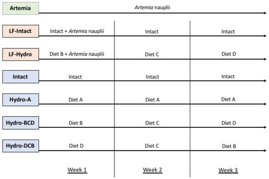Feeding regimens for experimental groups. Groups in green were fed with live feed, groups in orange were co-fed, and groups in blue were fed dry diets only. All diets were fed in excess during each feeding. The LF-Intact and LF-Hydro groups were fed decreasing amounts of Artemia starting on day 3 to wean them completely onto dry feed starting with week 2. The switch in diets commenced immediately after the sampling and measuring conducted at the end of each week.