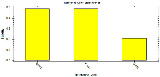 By applying the CFX Maestro™ Software (Bio-rad, Milan, Italy), the best reference gene was selected and its stability analyzed by means of the reference gene selection tool (CFX Maestro™ Software User Guide Version 1.1, Bio-rad, Milan, Italy). Following this analysis, the software indicated that eEF1a1 was the ideal HK based on the average M value (M = 0.48) (Figure 2).