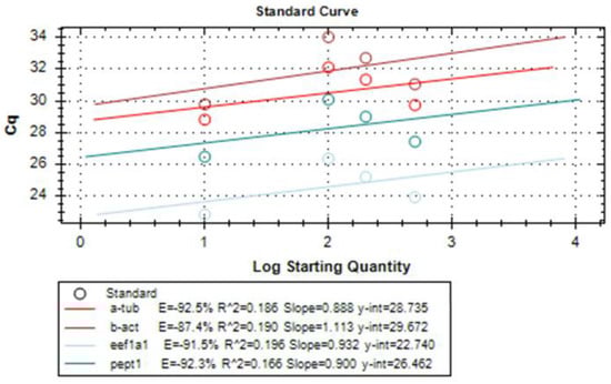 The accession numbers of the sequences used to design primers for HK genes were as follows: XM_038724778.1 for eEF1a1, MH018566.1 for α-tubulin, and MH018565.1 for β-actin. Primers were designed following the instructions given in the SYBR Green Supermix kit. The melting temperature was 60 °C. The open-source Primer3 under default settings was used to design the primers. Moreover, for the best qPCR efficiency, amplicon length for each pair of primers was set between 70 and 150 bp. Primers used to amplify target and HK genes are listed in Table 3.