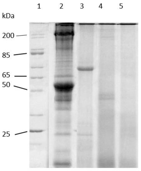 Figure 4 shows the results of the LMB muscle hydrolysates obtained using endogenous digestives enzymes from adult LMB on a 12.5% SDS-PAGE gel. This concept of hydrolysis has been demonstrated prior by Kwasek et al. [27]. This electrophoretic analysis was performed to confirm the products used in this study were hydrolyzed and to observe any differences that the incubation time had on the hydrolysates. The results from this gel show that the starting material was intact prior to digestion (Lane 2). This demonstrates that without incubation, very little hydrolysis occurred in the time period of harvesting, mixing with the enzymes, and increasing the temperature to 95 °C (heat shock). The intact LMB muscle was incubated with enzymes and samples removed at 1.5 h (Lane 3), 3 h (Lane 4), and 6 h (Lane 5). The hydrolysates were analyzed to observe the degree of hydrolysis over time. Based on these data, the supernatant shows a presence of proteins smaller than 65 kDa initially at 1.5 h. Peptides less than ~45 kDa were remaining after incubation of 3 h and by 6 h it appears that hydrolysis was complete with no observable peptides remaining. This suggests that the proteins had been reduced to small peptides of lower than ~25 kDa. Additionally, this gel confirms that the in vitro muscle hydrolysis process was able to hydrolyze the LMB muscle used in this study.