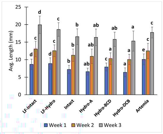 Diet effect on the average total length at the end of each week. Values are presented as means and error bars represent standard deviation for total length. Letters indicate statistical significance between groups. The significance was determined using a One-Way ANOVA and a Tukey test with a p value < 0.05.