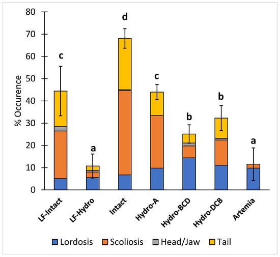 The occurrence of total skeletal deformities (scoliosis, lordosis, head/jaw, and tail) in the intact group was significantly higher than in all other groups, while there were significantly more deformities in the LF-Intact and Hydro-A groups than in the remaining groups. The LF-Hydro group had a significantly lower occurrence of skeletal deformities compared to all other groups except the Artemia group. There was no significant difference in skeletal deformities between the Hydro-BCD and Hydro-DCB groups. The results for skeletal deformities are presented in Figure 6.