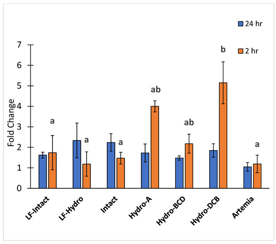 There were no significant differences in PepT1 gene expression between any of the groups 24 h after feeding. However, gene expression of PepT1 was significantly higher in the Hydro-DCB group compared to every group except Hydro-A and Hydro-BCD 2 h after feeding. The results for PepT1 expression are presented in Figure 7.