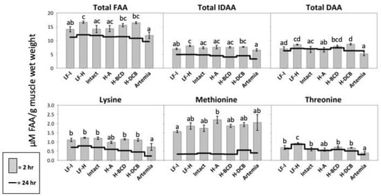 The LF-Hydro group presented with significantly higher postprandial levels of total FAA and IDAA in the muscle than the Artemia and LF-Intact groups (Figure 8). The Hydro-DCB group had significantly higher levels of total DAA than the Artemia, Intact, and Hydro-A groups. All groups that received dry feed, except Hydro-A, had a significantly higher level of free lysine than the Artemia group. Significantly higher levels of free threonine were measured in the muscle of the LF-Hydro group than in all other groups, and all groups that received dry feed, except Hydro-A, had a significantly higher level of free threonine than the Artemia group. The Hydro-A group had higher levels of free methionine than the LF-Intact group but did not differ significantly from those in the remaining groups. The Hydro-DCB group showed significantly higher levels of free aspartic acid compared to the Artemia group, and a significantly higher level of free asparagine than the LF-Intact group. The LF-Hydro and LF-Intact groups had significantly higher levels of free glutamic acid compared to the Hydro-A group, while the LF-Hydro group also showed levels significantly higher than those in the Artemia group. The Hydro-BCD and Hydro-DCB had significantly higher levels of free serine than all other groups, except the LF-Hydro group. The Intact group had a significantly higher level of free glutamine than the Hydro-A group. The Artemia group had a significantly lower level of free histidine, tyrosine, arginine, and phenylalanine than all other groups. The LF-Hydro group had a significantly higher level of free glycine than all groups, except the LF-Intact group. The LF-Hydro group also had significantly higher levels of both free arginine and tyrosine than all other groups, except the Hydro-BCD group. The postprandial level of free alanine in the muscle was highest in the Hydro-DCB group, significantly higher than all groups except LF-Hydro and Hydro-BCD. The Hydro-BCD group had the highest level of free phenylalanine, significantly higher than all other groups except for the Intact group. The Hydro-BCD group also had the highest level of free tryptophan, significantly higher than the LF-Hydro, Hydro-A, and Artemia groups. The postprandial level of free proline in the muscle was highest in the Hydro-DCB group, significantly higher than all other groups except for Hydro-A. No significant differences were observed in the postprandial levels of free leucine, isoleucine, valine, and cysteine between groups. The postprandial results for all FAA analyzed are presented in Table 5 (2 h) and Table 6 (24 h).