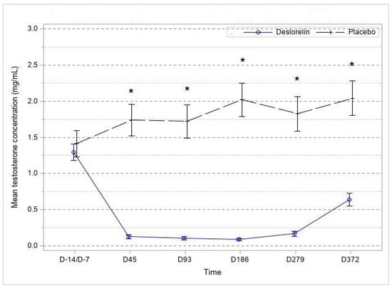 Evolution of serum testosterone level over time (expressed as mean ± SE). * Significant difference (p < 0.001) between groups from D7 onward.