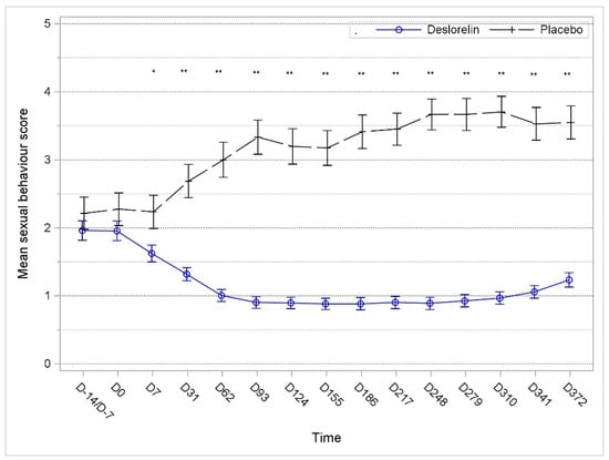 Course of mean sexual behavior score (expressed as mean ± SE) in the deslorelin and control groups over time. * Significant difference (p = 0.013) between groups. ** Significant difference from D31 onward (p < 0.001).