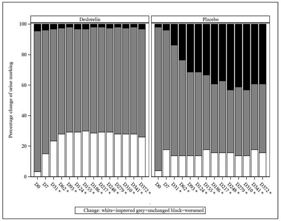Percentage change in urine marking compared to baseline. * Significant difference (p < 0.001) between groups from D31 onwards.