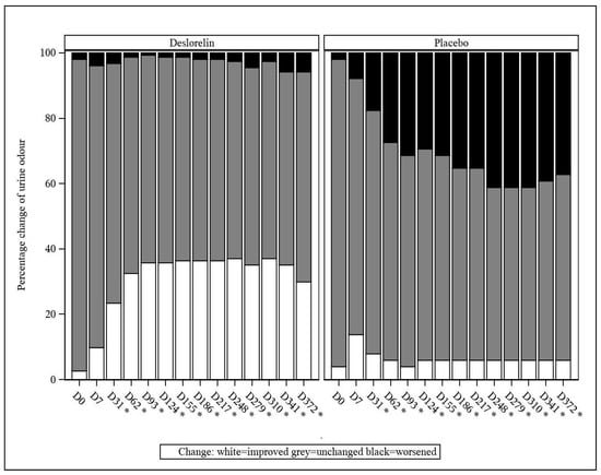 From D31 onwards, a decrease in the incidence of urine marking (classified as an improvement) was observed at a significantly higher percentage in the deslorelin group than in the control group (p < 0.001; Figure 3). The same occurred from D31 onwards, with worsening of the intact male cat urine odor being observed at a significantly lower percentage in the deslorelin group compared to the control group (p < 0.001; Figure 4).