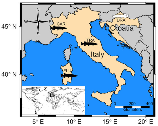 During 2013–2018, caudal fin-clips were collected from E. cisalpinus and E. lucius from four localities (Figure 1). Individuals of E. cisalpinus variety from Alto Flumendosa Lake (FLU, N = 60) were caught with shore-fishing equipment (fishing rod). Individuals of E. cisalpinus variety from Carignano-La Loggia (CAR, N = 28) and Trasimeno Lake (TRA, N = 20) as well E. lucius from Drava river (DRA, N = 22) were caught by electrofishing (see Casu et al. [27] for further details). Those individuals were then subjected to a non-lethal sampling method by means of small tissue portion removal (fin-clips) and immediately transferred to a recovery tank before being released. Caudal fin-clips were placed in 1.5 mL test tubes filled with 96% ethanol and carried to the laboratory, where they were stored at −20 °C until DNA isolation. Genomic DNA was purified using the Macherey-Nagel NucleoSpin Tissue kit according to the supplier’s instructions and the concentration was estimated by spectrophotometry at 260 nm using a Nanodrop Lite Spectrophotometer (Thermofisher Scientific).