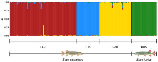 Only five individuals (three from FLU and two from CAR) were admixed (q < 0.80); among these individuals, only those from CAR showed a small membership (0.06 ≤ q ≤ 0.10) to the cluster in which all northern pike were assigned (Figure 2).