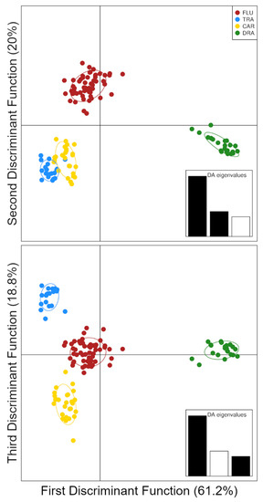 Since the inferred clusters perfectly matched the sampling localities (Supporting information, Figure S4), only the DAPC results based on the latter are depicted and discussed henceforth. Discriminant analysis was carried out, retaining the first 30 principal components selected by the cross-validation procedure. The ordination plots of the discriminant functions (DF) highlighted the hierarchical genetic structure of the data (Figure 3). The first DF, which accounted for most of the genetic variation, highlighted the separation between the two species, E. lucius and E. cisalpinus, whereas the remaining DFs showed the genetic structure within the latter. The second DF separated FLU from the mainland populations, whilst the third DF highlighted the differences between CAR and TRA.