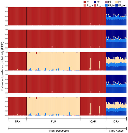 In three out of five runs, nearly all individuals from TRA (the reference population for E. cisalpinus), FLU, and CAR were classified as pure with high posterior probabilities (q > 0.9) and assigned to the same genotypic class (Parental population 1, P1). In contrast, in 2 out of 5 runs, all individuals from FLU and one from CAR were classified as hybrids and assigned to the F2 genotypic class with q > 0.50; however, 51 out of 58 individuals from FLU were classified as F2 hybrids when q > 0.90 was used as the criterion to assign individuals to a given genotypic class. In contrast, more than half of the individuals from DRA (the reference population for E. lucius) could not be assigned to any genotypic class, even when adopting a more liberal threshold (q > 0.50). In three out of five runs, ten individuals were classified as pure and assigned to the parental population P2 using this threshold. Only ten individuals from DRA (the reference population for E. lucius) were classified as pure and assigned to the other parental category (P2) using the most liberal threshold (q > 0.50) in three out of five runs. Otherwise, they were left unassigned across all runs if more conservative criteria were used (q > 0.75) and even when the most liberal threshold was adopted in two out of five runs.