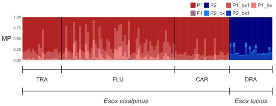 Assignment of individuals to different genotypic classes based on the Expectation–Maximisation algorithm. The bar plot shows the membership probability (MP) of each individual of being a pure southern or northern pike, an F1, or a backcross hybrid between the two parental species. Genotypic classes are arranged as in Figure 4; note, however, that the algorithm implemented in SNAPCLUST does not allow one to distinguish F2 hybrids.