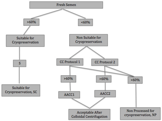 After colloidal centrifugation, samples in which progressive motility increased ≥60% were reclassified as “Acceptable After Colloidal Centrifugation” (AACC), distinguishing between “Acceptable After Colloidal Centrifugation with Protocol 1”, (AACC1) and “Acceptable After Colloidal Centrifugation with Protocol 2” (AACC2). Semen samples whose progressive motility did not increase to 60% after colloidal centrifugation were definitely rejected for cryopreservation (non-processed samples, NP).