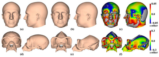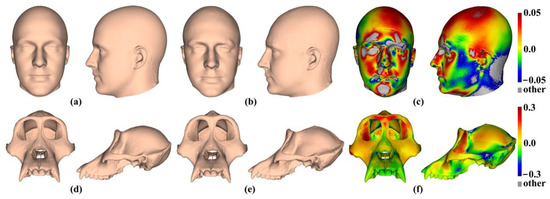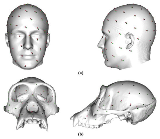We used two datasets comprising surface meshes that exhibit varying degrees of complexity: 100 adult human male heads comprising 16 anatomical landmarks from the Liverpool–York Headspace dataset [34,35] and 20 ape crania consisting of 41 anatomical landmarks (5 Gorilla, 5 Hylobates lar, 5 Pan troglodytes, and 5 Pongo abelii [36]. We extracted the external surfaces of heads and ape crania to avoid the internal surfaces interfering with the projection of semilandmarks. The 3D meshes were post-processed by smoothing surfaces, removing the irrelative discrete vertices, and repairing self-intersecting triangle meshes. Compared with human heads, the sample of ape crania of different species shows greater size and shape variation and presents more complex surfaces.