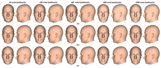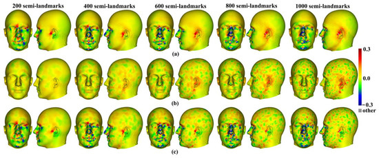 Within each approach to semilandmarking, the local variations in the area between the human head mean surfaces estimated by increasing semilandmark densities and the surface from the 1000 semilandmarks were visualised as colour maps. These are presented in Figure 12a–c. Consistent with the Procrustes distances presented in Table 4, the closest fitting surfaces are between the surfaces derived using semilandmarks from sliding TPS and TPS&NICP. The colour maps comparing these surfaces with those from the 1000 semilandmarks are relatively smooth (Figure 12a,b). Further, as semilandmarking density increases, the surfaces based on lower densities of semilandmarks converge with the surface from the 1000 semilandmarks. Differences are more pronounced between surfaces derived using lower semilandmarks densities and the 1000 semilandmarks generated by the LS&ICP approach. This reflects the generally greater Procrustes distances presented in Table 4, and, visually, differences are most evident in the face (Figure 12c). The nasal, ocular, and perioral regions show localized large differences but converge with increasing semilandmarking density on the surface derived using 1000 semilandmarks, particularly around the nose and eyes. However, with increasing semilandmark densities generated by LS&ICP, the quality of the mean surfaces is poor (i.e., less sharp features around the eyes and mouth in Figure 4c) because equivalent semilandmarks lie in different anatomical locations.