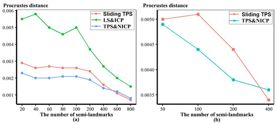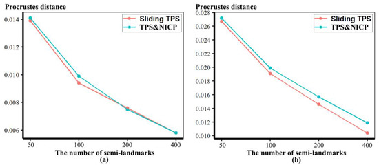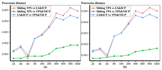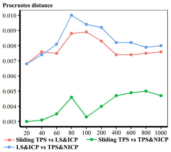 Comparing these distances between different semilandmarking approaches (Figure 6a) indicates that the full set of vertices of the mean surface generated from sliding TPS are, in general, most similar (smallest Procrustes distances) to those from TPS&NICP at all semilandmarking densities, and these distances increase with increasing semilandmark density. The Procrustes distances between mean surfaces based on semilandmarks from LS&ICP and both sliding TPS and TPS&NICP are, in general, larger and also tend to increase with increasing semilandmark density.