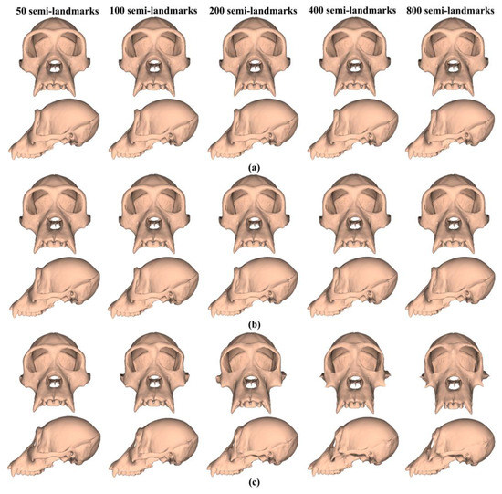 Visualization of the head mesh surfaces generated using different semilandmarking approaches after re-semilandmarking and re-warping. (a) Sliding TPS. (b) TPS&NICP approach. (c) LS&ICP approach. Increasing semilandmark density from left to right.