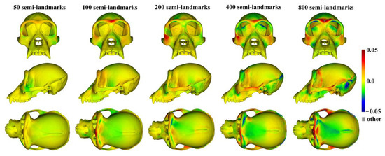 Statistical considerations aside, high-density semilandmarks are routinely used to assess shape variations and covariations and to perform classification [41,43,44,45], with results presented as visualisations of a warped surface mesh. It is, therefore, of interest to know how different semilandmarking approaches and semilandmark densities affect visualisations. This has been addressed by the analyses presented here.