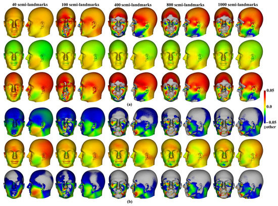 Differences between the mean surfaces of human heads derived from different semilandmarking approaches and densities of semilandmarks are illustrated in Figure 7. This visualises differences in areas of equivalent triangles in the template surface mesh derived from each semilandmarking approach and density after re-semilandmarking and re-warping (see Figure 3). Figure 7a visualises the differences in shape among mean surface meshes from sliding TPS (reference) and LS&ICP.