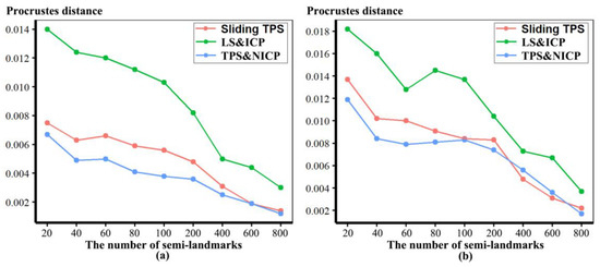 Figure 10a shows the superimposed scatterplots of PC1 vs. PC2 from separate PCAs of the estimates of the mean surface of the human heads obtained using each semilandmarking approach. The sliding TPS and TPS&NICP approaches result in very similar PC plots, while the PCA of estimated mean surfaces generated by LS&ICP approach in a plot showing a similar pattern of variation among means, but with greater variance in both PCs (larger scatter). Similarly, for estimates of the mean surface among the ape crania derived using the sliding TPS and TPS&NICP approaches, the first two PCs from each separate PCA are superimposed in Figure 8b. These plots indicate that sliding TPS and TPS&NICP produce very similar scatters of estimated means. Both plots of Figure 10 present ‘U’-shaped curves, with the means estimated using the lowest and highest densities of semilandmarks having higher scores on PC2, although they are widely separated in PC1.