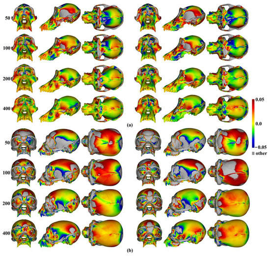 Similar comparisons were undertaken for the ape crania. Figure 13a,b show regional differences in the area of mean surfaces computed between lower densities and the maximum density of 800 semilandmarks generated by the sliding TPS and TPS&NICP approaches. In both, the smallest differences are found in the cranial vault, where the colour map is smooth and indicative of small local area differences. Larger differences are observed around the frontal bone, supraorbital ridges, zygomatic arches, malar region, nasal bones, and maxillae. Consistent with Table 5, with increasing semilandmark density, a degree of convergence occurs with the surface based on the 800 semilandmarks.