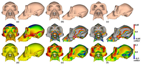 Similar analyses are conducted to assess how landmarks alone perform in predicting allometrically scaled surfaces, just as they might be carried out where no initial estimate of the mean surface is possible (e.g., hand-collected landmark data), but a surface mesh is available for warping. These focus on the comparison of the surface of the individual head closest to the mean and the ape surface used to generate the template, warped to the allometrically scaled landmark configurations, with those from the allometric scaling of the template surfaces based on all landmarks and the maximum densities of the semilandmarks. The results for the predictions of surfaces at the maximum sample centroid sizes are presented in Figure 25, and the minimum centroid sizes are in Figure 26. Note that the scale bar used to compare ape cranial means is wider than those used elsewhere because the differences are greater. In both cases, the surfaces of individuals warped to fit the allometrically scaled landmark configurations (Figure 25b,e and Figure 26b,e), are superficially similar to those derived by warping the template to the allometrically scaled landmark and the highest density semilandmark configurations for each dataset. However, they differ in detail such that the human head surfaces estimated using landmarks alone and the surface of the individual nearest to the mean (Figure 25b and Figure 26b) present more rounded faces with subtle differences around the eyes, mouth, and nose when compared with the template surfaces warped to the allometrically scaled landmark and semilandmark configurations (Figure 25a and Figure 26a). The same comparisons for the ape crania (Figure 25d vs. Figure 25e and Figure 26d vs. Figure 26e) present more obvious differences, particularly around sagittal and nuchal crests, orbits, and temporal fossae.