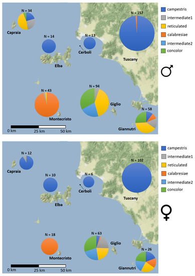 The six main DP categories found in the Tuscan Archipelago. Picture for “campestris” by the anonymous iNaturalist user “gavinh” (link to the observation: https://www.inaturalist.org/observations/27295298; accessed 1 May 2022); picture for “calabresiae” by Mattia Menchetti (link to the observation: www.inaturalist.org/observations/691003; accessed 1 May 2022); pictures for “reticulated”, “concolor”, “intermediate 1” and “intermediate 2” taken by Enrico Lunghi during one of the sampling sessions on Giglio Island (see Lunghi et al. [31] for photographic methods).
