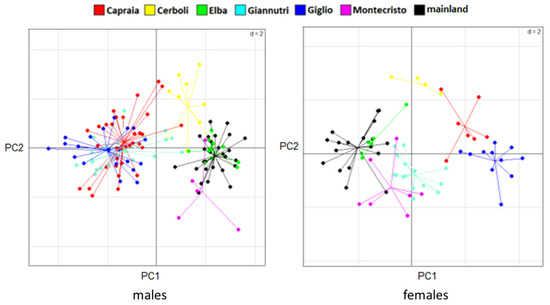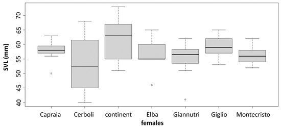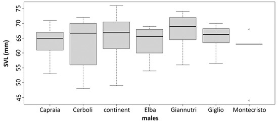 The PCA results are slightly different between sexes. In males, there are two very distinct groups: one being composed of Giglio, Capraia and Giannutri and one of Elba, Cerboli, Montecristo and mainland Tuscany. In females, we can still distinguish two groups but less distinct than in males: one that includes Giglio and Capraia which are quite similar to each other, and one that includes Elba, Montecristo, Giannutri and mainland Tuscany with Cerboli being intermediate between the groups (Figure 4). MANOVA confirms the significance of these differences in morphological traits between sexes and between localities. On the contrary, ANOVA shows the presence of statistically significant differences in SVL between sexes only, with males being larger than females. There are not statistically significant differences in SVL between the different sampling localities (between islands and between islands and mainland Tuscany). MANOVA and ANOVA results are reported in Table 2 and Table 3, respectively. SVLs are shown in Figure 5.