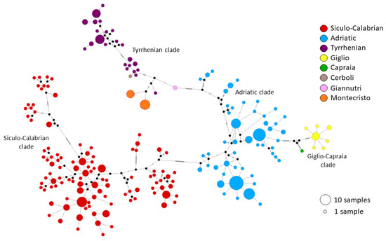 Median joining network built on cytb sequences. Colors represent the three main clades described by Senzcuk et al. [25] and the islands of the Tuscan Archipelago. The Siculo–Calabrian clade includes Sicily, Sardinia, Southern Corsica and the Southern part of Calabria; the Adriatic clade includes Campania, the Adriatic coast, Croatia and the Northern part of Calabria; the Tyrrhenian clade includes Giannutri, Montecristo, Cerboli, Northern Corsica and the Tyrrhenian coast. Giglio and Capraia are shown in yellow and green on the right.