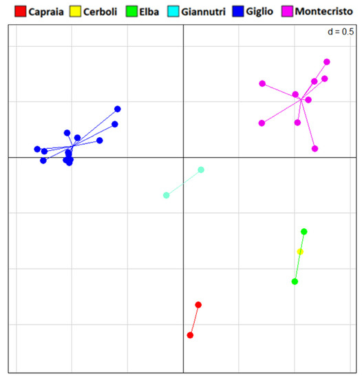 All 29 sampled individuals were successfully genotyped using our microsatellites panel (see Table S5 for details). However, only seven out of the eight loci were successfully obtained. In the sPCA (Figure 7), all the islands appear distinct from each other with the sole exception of Elba and Cerboli, which show full overlap.