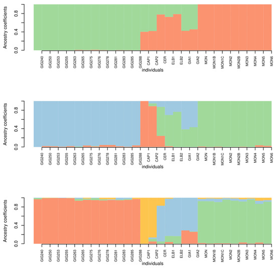 Bar plots for k = 2 to k = 4 (top to bottom). The names of the individuals are labelled below separated by thin white vertical lines (GIG = Giglio, CAP = Capraia, CER = Cerboli, ELB = Elba, GIA = Giannutri, MON = Montecristo).