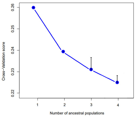 Cross-validation scores for k from 1 to 4. The lower the CV-score, the better fitting is the number of ancestral populations. k = 4 is the best fitting value. Black bars represent the estimated error.