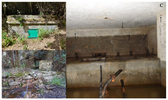 (A,B) show the two artificial springs in which Speleomantes sarrabusensis occurs. In (C), it is possible to see part of the inner environment of one spring; arrows are pointing to a few individuals that are clinging on the concrete walls.