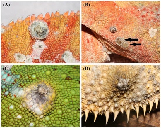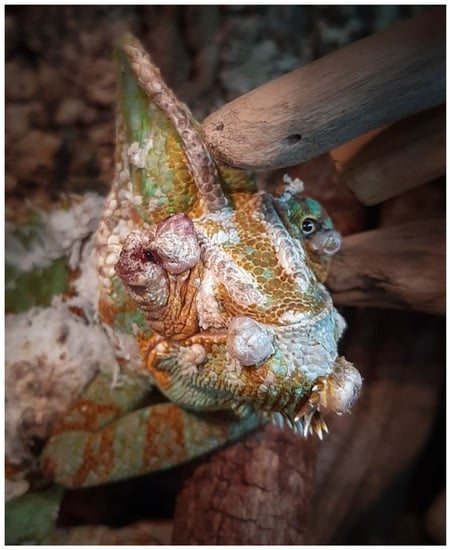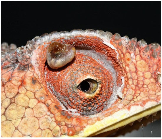 - Meyer, J.; Kolodziejek, J.; Häbich, A.C.; Dinhopl, N.; Richter, B. Multicentric Squamous Cell Tumors in Panther Chameleons (Furcifer pardalis). J. Exot. Pet Med. 2019, 29, 166–172. [Google Scholar] [CrossRef]
