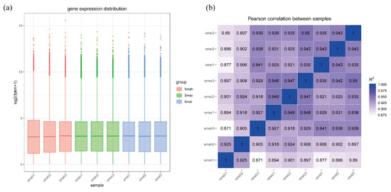 Gene expression was calculated for each sample according to the expected number of fragments per kilobase of transcript sequence per million base pairs sequenced (FPKM) method, and the expression level of each sample was represented by a box plot in order to examine the distribution of FPKM under different experimental conditions at an overall level. The box plot of gene expression (Figure 1a) showed consistent changes in gene expression levels for Smsh (35‰), Smsc (20‰), and Smsl (10‰), indicating that the transcriptome sequencing results were good for subsequent analysis. The sample correlation heat map of gene expression (Figure 1b) showed that the similarity of expression patterns between samples was high, indicating high experimental reliability and reasonable sample selection.
