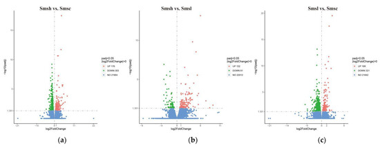Volcano plot of DEGs in different salinity comparison groups. (a) Smsh vs. Smsc volcano plot; (b) Smsh vs. Smsl volcano plot; and (c) Smsl vs. Smsc volcano plot (Table S3: Diff_stat).