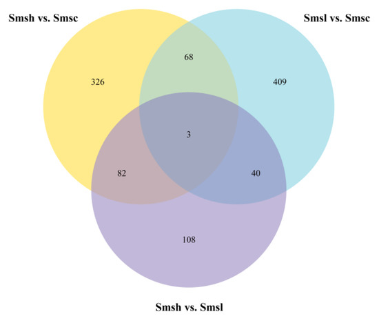 As shown by the Venn diagram (Figure 3), there were 68 significantly differentially expressed genes in Smsh compared with Smsl, 82 and 40 differentially expressed genes in Smsh and Smsl compared with Smsh vs. Smsl. In addition, a total of three differential genes were significantly expressed in the three groups, namely, phosphatidylinositol 3-kinase regulatory subunit 6b (pik3r6b), cytoplasmic phospholipase A2-γ-like gene (cPLA2γ-like), and WD repeat and SOCS box containing 1 (WSB1). As shown in Table 4, the expression of their differential genes also differed according to salinity stress, with pik3r6b, cPLA2γ-like, and wsb1 all significantly differentially expressed in the high-salt group.