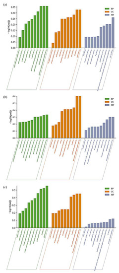 GO analysis of DEGs in different salinity comparison groups. (a) GO analysis of DEGs in the Smsh vs. Smsc; (b) GO analysis of DEGs in the Smsh vs. Smsl; and (c) GO analysis of DEGs in the Smsl vs. Smsc.